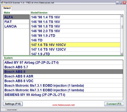 A. The current release supports only engine control units and the MY97 Airbag system. The ABS system uses a seperate control unit. A future release of AlfaDiag will support the ABS control unit. It will allow you to read and clear fault codes from the ABS system. It will also support reading sensor data and activating the actuators of the ABS system.[/quote]