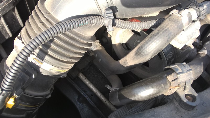 Eli noiden letkujen välistä alaspäin tiirailet (tuon ylimmäisen hihnapyörän alapuolella) enempi moottorin suuntaan. Ni sieltä löytyy laturinhihna ihan ton näkyvän remmin takaa, alempaa. Se laturinhihna on vajaa 60cm lyhyt käikäle. Laturi on se ylempi laite ja ilmastoinnin kompura se alempi - niiden välillä se lyhkäne laturinremmi.