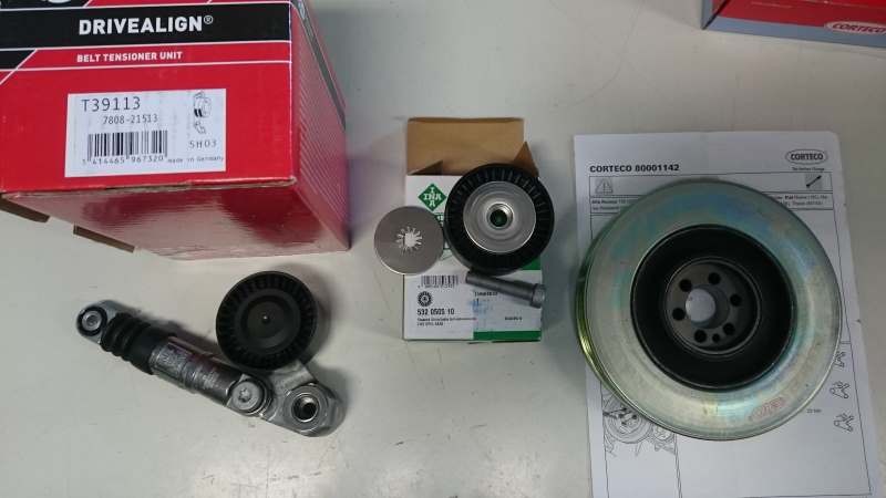 Tilasin uuden kampiakselin hihnapyörän, kiristimen ja ohjainrullan pidemmälle hihnalle. Jotain tuolle on tehtävä, kun kitinä melkein tuntuu pahentuneen laturin uusimisen ja hihnojen vaihdon jälkeen. Ensin kyllä vaihdan vain hihnapyörän, uskon sen riittävän. Ihan hävetää tuolla ajella