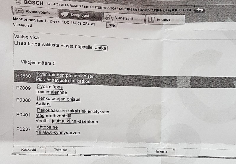 Soitin liikkeeseen ja käskivät oman kaupungin vianorille. Vianorilta saatiinkin vikakoodeista irti muutamakin juttu(kuva).