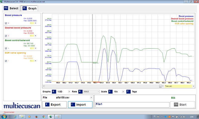 Juu, en yhtään epäile etteikö se antaisi 1,5 bar tai enemmänkin, jos pyydetään. Käytännössähän ahtopaine käy hetkellisesti pyynnin yläpuolellakin. Katselin tuossa omia käyriäni 2,4 JTD 20 v:llä (ei JTDm), ja täydellä kaasulla kiihdyttäessä ECU on tilannut ahtopainetta enimmillään 1,46 bar. Siihen nähden tuo 1,5 bar ei siis viittaakaan virisoftaan. No, pääasia että on kunnossa. Nopeusmittauksen tarkkuus 0-100 km/h kiihdytyksessä on sikäli aika olennainen, että pienikin heitto nopeudessa tarkoittaa helposti monta kymmenystä ajassa. Siksi kiihtyvyyslukemastakaan ei voi välttämättä päätellä mitään. Mutta mutta, etkö näe OBD:sta softaversion tai ainakin sen päiväyksen?