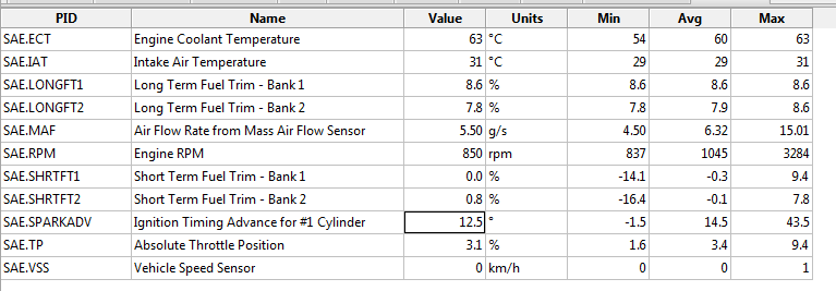 ScanXL:n seuraavanlaista dataa. Short Term Fuel Trim - Bank 2 käy 3550 rpm jälkeen kaksinumeroisissa lukemissa (10.2% - kevyesti kierroksia nostettaessa), joka ei pitäisi olla normaalia? Pitääpä vieläuudestaan käydä mittaamassa paremmin noita miten käy kun lyö moottorille kierroksia.