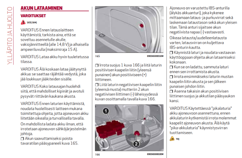 Juu, tuossa ohjeessa kyllä neuvotaan asia oikein (miinuskaapeli ei akkuun, vaan koriin), mutta äkkiseltään voi tulla luettua väärinkin. 2018 Fiat 500C:n ohjekirjassa taas neuvottiin se valvontajohdon irroitus. IBS kai resetoituu, kun akku on ollut irti jonkun aikaa, mutta en tiedä, onko Giuliassa jotain siihen liittyvää huomioitavaa, kai se ohjekirjassa kuitenkin sanotaan.