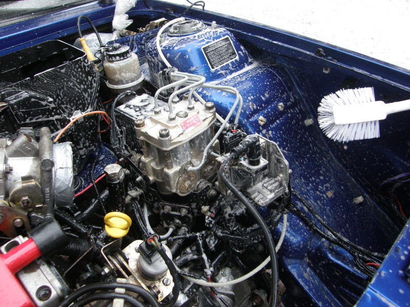 Kilven puhdistus ja valojen rekisterikilpitelineen paikalleen asettelu. Tämä sujui yllättävän helposti. Valot kiinni telineeseen sekä puskurin yläosaan ja vetämään piuhoja maskin välistä ja sen taakse. Sen jälkeen päästiin piuhoja kiinnittelemään akun napoihin ynnä muuhun. Avataan pitkien umpio kun pitäisi löytää kaukovalon + -johdin... ja kiitos Fernando. Sieltä löytyy kaksi mustaa piuhaa. Yleismittarilla tutkimaan. Rele kiinni ja piuhat kiinni. Jippikaijeij, valot toimii!