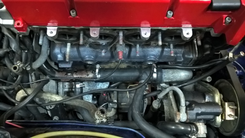 ....Käsittämättömän ahtaasti. Pitääkö imusarja tosiaan purkaa?! Pitää. Hetken jo aatteli että myös pakosarja pitää ottaa alas(johon tämä homma olisi tainnut jäädäkin..), mutta ei aivan....Uitat vasemman käden kyynärtaivetta myöden koneen ja tulipellin väliin ja katkaistulla avaimella(27 vaikka pitäis olla 26..) yrität avata . Luojan kiitos ei ollut purrut kaamean tiukkaan ja narahti auki. Loput sit helppoa, vai mitä. Haha! Tilaa nylkyttää auki on noin neljä senttiä molempiin suuntiin joten ei onnistu! Sormin ei todellakaan onnistu. Lambdahylsy on niin lähellä tulipeltiä, että kun käännät auki puolikierrosta niin johto kiilautuun jumiin tulipellin väliin ja ei liiku milliäkään. Edelleen siis koko ajan vasemmalla kädellä suorittaen ja lampulla näkee sisäkennolle menevien letkujen alta vain juuri ja juuri yhdestä kohtaa. Aika kaivaa esiin kohteen "pieni kätisin mies" joka onnistuu kiertämään lambdan auki mutta sitten hylsy ei enää tulekaan pois kun on jumissa. No kiinni alle pari kierrosta ja ihmeen kaupalla hylsy muljahtaa pois ja lambda suostuu kääntymään pienemmillä kahdella sormella auki tarvittavat 1,23- kierrosta....Oma käsi on vereslihalla kyynärvarren alta ja kananmunan kokoisella turvotuksella varustettuna...Saan kuulemma kiinnittää uuden ihan sitten itse, ja niin myös teen. Nyt jo verikin lentää perinteisesti. Saan uuden anturin kierteelle ja narautettua kiinni lopulta suht helposti. EI satu kuin ihan helvetisti