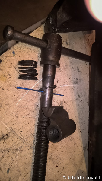 Ykkös kuvan lukitussokka/ruuvi pitää irrottaa ensin että jousi+prikka vapautuu.Otetaan stopparitappi pois alhaalta päin tuurnalla lyömällä.Itse tajusin tuon vasta kasaus vaiheessa ja tappikatkesi kun yritin yläkautta irti.Näkyy 2 kuvassa punaisella tussilla merkittynä lohenpyrstöliitoksen edessä. 3 kuva purettuna.Sitten vaan pyörittää karan pois.Jousi ei ollutkaan poikki vaan edellisen omistajan prikka ja sokka olivat vääntyneet ulospäin ja jousi löystynyt.