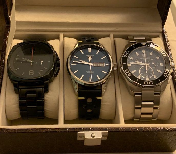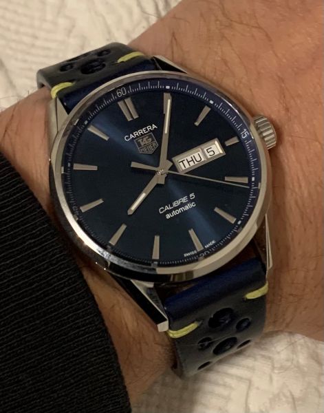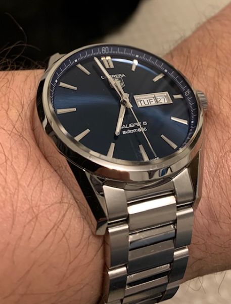 Kun hiljattain en saanut ostopäätöstä tehtyä Porschen Carrerasta, niin TAGin versio vanhasta meksikolaisesta autokilpailusta tipahti ranteeseen. Tarkemmin vitoskaliberin sisuksilla varustettu sinitauluinen day-date. Vuoden käytetty, ns Full set, tehdastakuutakin vielä vuodenpäivät. Oikein kivassa iskussa ja hintakin oli kohdallaan, niin liipaistava oli. Kolmen kellon boxissa on Aquaracerin ja Carreran vieressä vielä paikka Monacolle. Sitten elämä on valmis!