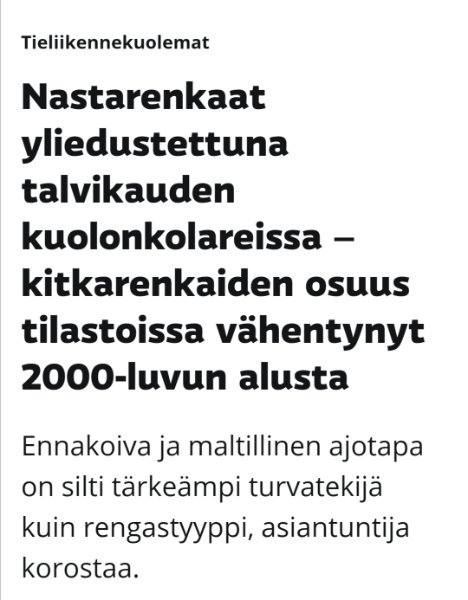 Hä? Se perinnetietohan, mitä VTT, Tekniikan maailma ja HS edelleen levittävät on, ettei hengissä voi selvitä ilman nastarenkaita.