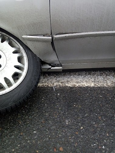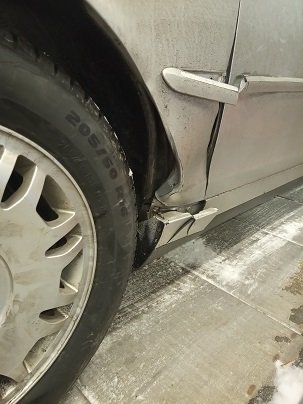 Kyllä siinä on ihan oikea vaurio taustalla. Pellin oikominen ei riitä, vaan etupään tuentaa joutuu rakentelemaan uusiksi. Ei siis mennyt osina myyntiin omistajalta vaan vakuutusyhtiön kautta.