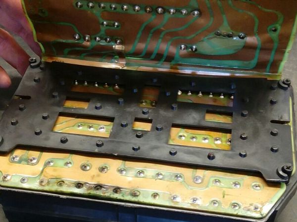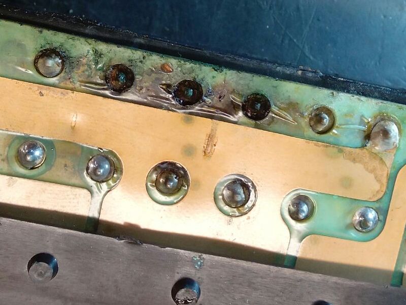 Tuossa pari kuvaa siitä, miltä Biturbon sulakerasia voi näyttää sisältä. Rasian sisäinen johdotus on tehty neljällä päällekkäin pinotulla taipuisalla piirilevyllä. Vesi pääsee niiden väliin ja elektrolyysi hoitaa loput: syntyvä liuos johtaa vaihtelevasti sähköä sulakepiirien välillä. Tilannetta voi yrittä korjata irrottelemalla levyjä toisistaan sen verran kuin saa (ne ovat tietenkin juotosten kohdalta yhdessä) ja huuhtelemalla moskat pois välistä vaikka kontaktispraylla tai isopropanolilla. Samalla on syytä korjata irtoilleet juotokset, aivan erityisesti ne konehuoneen puolelta tulevat kaksi päävirtasyöttöä.