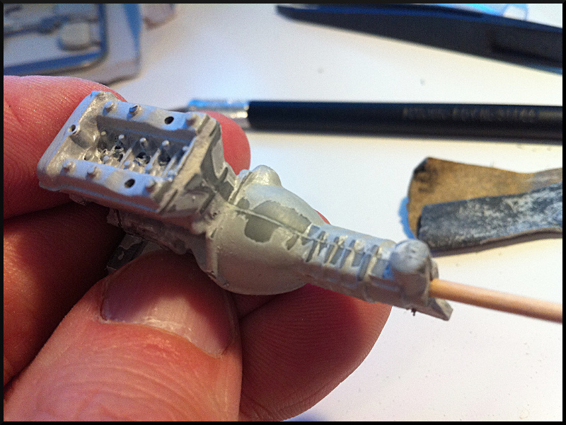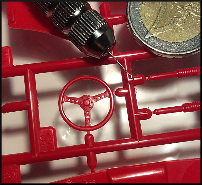 Siirryin hetkeksi sisustan puolelle ja totesin, että ainakin ratti tarvitsee hieman korjailua. Puolien reikien tilalla oli valun jäljiltä vain pienet painaumat, joten ne piti porata auki. Teräksi 0,5mm ja sormipora pyörimään. Lopuksi vielä hieman suurensin sisempiä reikiä. Suurimman kooksi tuli 0,7mm. Melkoista niperrystä, mutta ihan hyvä tuosta tuli. Sitten vaan maalia pintaan.