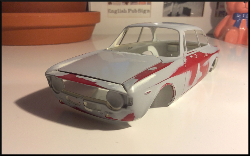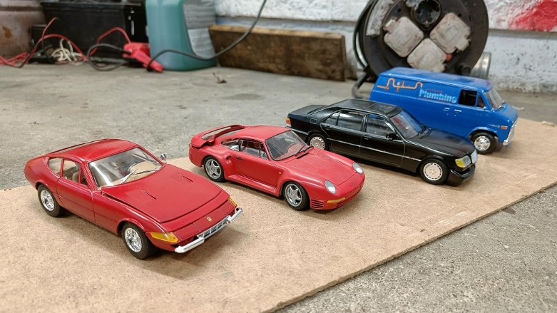 Ferrari oli aika pitkälle valmis, kori tosin pitää maalata uusiksi kolhujen takia ja joitain osia maalata uusiksi. F100 taisi jämähtää kun jostain syystä kone ja laatikko ei tahtonut istua runkoon. Volkkarista varmaan puuttuukin jo osia rusaasti...