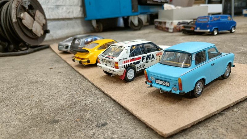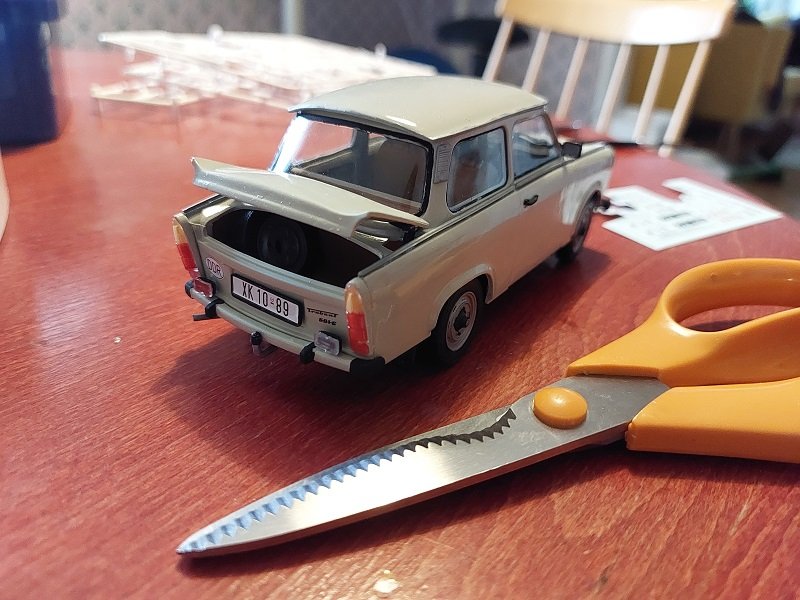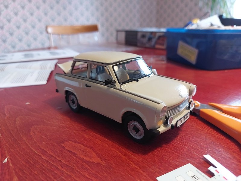 Hetki meni että viimein innostuin kasaamaan Trabantin loppuun. Tässä välissä oli unohtunut Aquatiqan suosittelema maali-lakka-siirtokuva-lakka järjestyskin. Maali oli kuitenkin kiiltäväpintainen ja kuvat tarttuivat sen pintaan paremmin kuin aiemmin linkitettyyn Trans Amiin (jossa karheaksi jäänyt kilikali-musta ennen siirtokuvia). Maalien kanssa menin "sillä mennään mitä löytyy" periaatteella. Vähän piti tinkiä joissain kohdissa koska osa maaleista oli jo kuivunut purkkeihinsa.